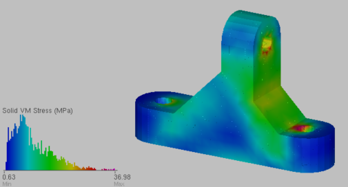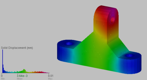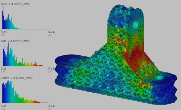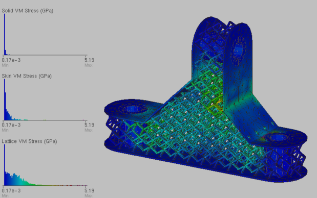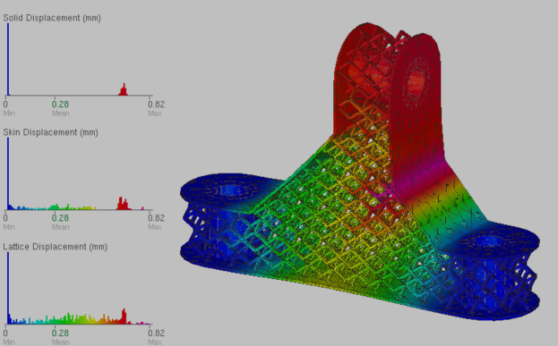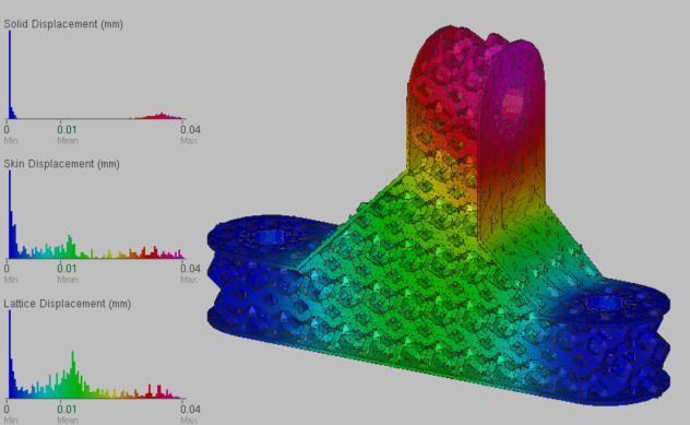 The amount of skin and lattice displacement, close to 1 mm, may be of concern in this model. For comparison, we can readily simulate the use of thicker lattice bars, and a completely solid part.