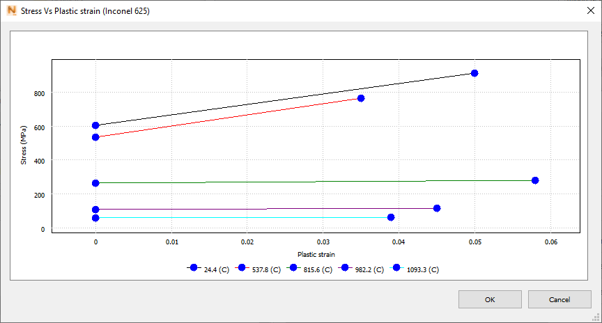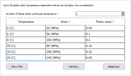 - Plasticity - Up to 10 pairs of stress-strain points can be used to describe the plasticity curve of the material at each temperature. Perfect plasticity is assumed after the final plasticity point at each temperature. Every temperature must use the same number of points. To enter the plasticity curve, specify the temperature, stress, and strain. Points with the same temperature will describe the yielding behavior at that temperature. For example using 3 points to describe the yielding behavior of a metal would look like this:
