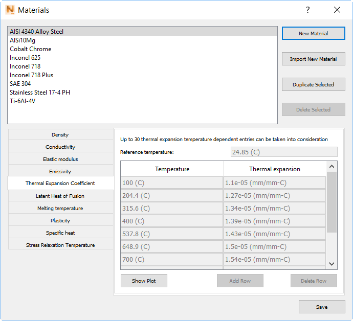 build plates, minimum requirements are Thermal Conductivity, Density, Specific Heat, Coefficient of Thermal Expansion, Elastic Modulus, and Plasticity properties.
