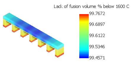 - Lack of fusion volume % below <temperature> – This is a global, single increment result, which shows the possible percentage of each element that falls below the specified temperature, in Celsius, Fahrenheit, or Kelvin degrees. The example below is for the material Ti-6Al-4V.