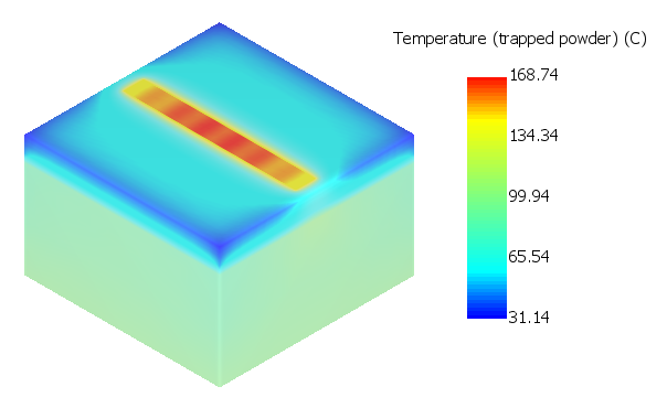 - Temperature (trapped powder) - thermal results of the thermal simulation which displays the powder elements in addition to the parts and supports. These only exist if