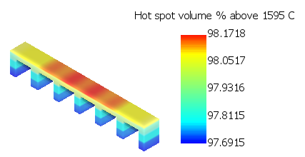 - Hot spot volume % above <temperature> – This is a global, single increment result, which shows the possible percentage of each element that exceeds the specified temperature, in C, F, or K degrees. The example below is for the material Inconel 625.