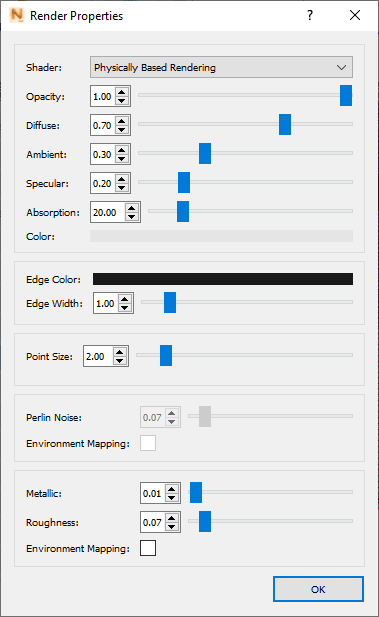Depending on the shader selected, additional controls are activated for you to adjust other settings such as lighting, opacity, and element edge color. Experiment with effects by using the slider for each setting. Numeric values are shown if you need to record them to replicate the effect at another time. You can always reset the rendering by clicking the small render reset button