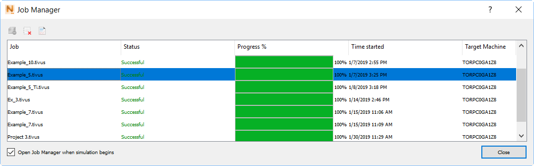 The Job Manager window opens when a Part Scale Powder Bed or DED simulation begins, unless you have deselected the check box in the lower left corner, as shown below. When the simulation ends, results are automatically loaded into Simulation Utility.