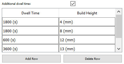 If Additional dwell time is selected, you can populate table rows with the duration in seconds to pause at specified build heights for operations such as refilling powder or machining during a hybrid printing process. Each build height value must be higher than the value in the row above.