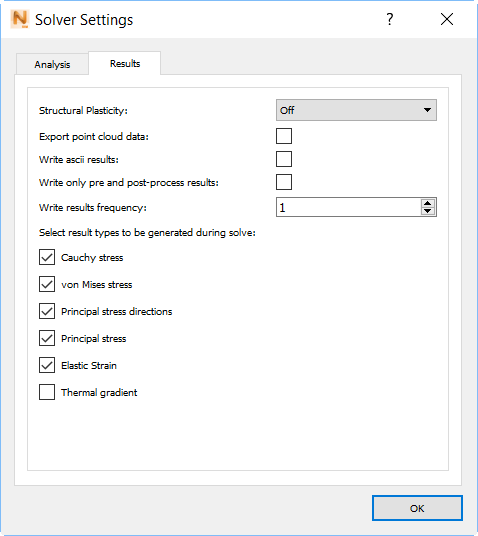 Turn structural plasticity on or off, choose results writing options, and select the desired stress and strain result types.