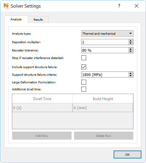 Stop if recoater interference detected ends the simulation if the built part deflects upward far enough to exceed the specified Recoater tolerance.