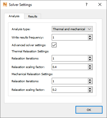 Select the Analysis type, results frequency, and optionally, advanced settings for thermal and mechanical relaxation.
