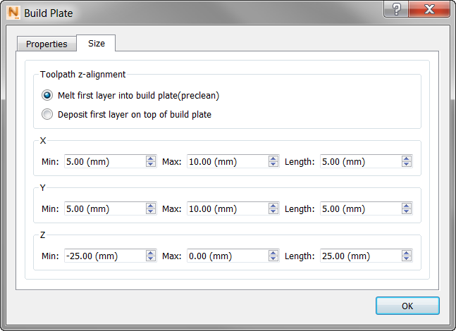 Also on the Size tab, you see adjustment fields for each axis. The Length settings for X and Y are useful for sizing the top of the build plate, and the Z control for setting the build plate thickness.