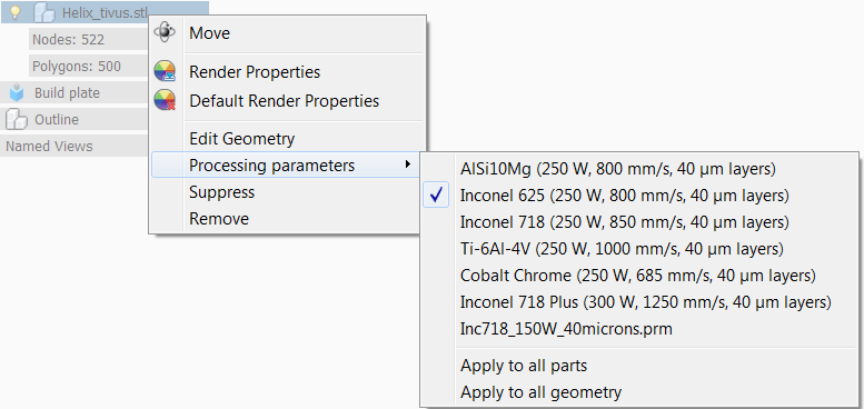Processing parameters field disappears, and you will select the PRM file for each part or support structure by right-clicking the geometry in the Browser.