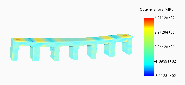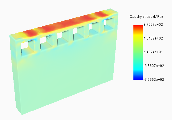 The simulated parts below show the predicted stresses and displacements after the part is removed from the build plate by electrical discharge machining (EDM). The upper figures in green show the Cauchy stress simulation results. In the two lower figures, the red and blue colored shapes show simulation results, while the grey shapes show experimental results, which indicate reduced displacement.