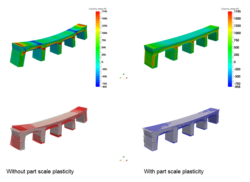 The results on the right are generated with Structural Plasticity turned On. This method produces accurate results with the part still on the build plate, and introduces plastic yielding at the end of the part level simulation, resulting in more accurate simulation of residual stresses and post-EDM distortion.