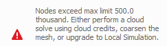 This error occurs when the generated mesh during a solve exceeds the LT limit of 500000 nodes. Reduce the mesh density by increasing the number of coarsening generations, increasing the number of layers per element, or turning off Conduction to Loose Powder in the Operating Conditions menu.