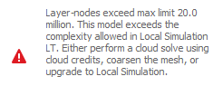 This error occurs when the generated mesh during a solve exceeds the LT limit of 20 million layer-nodes. Layer-nodes are the maximum number of nodes multiplied by the number of layer groups. Reduce the mesh density by increasing the number of coarsening generations, increasing the number of layers per element, or turning off Conduction to Loose Powder in the Operating Conditions menu.