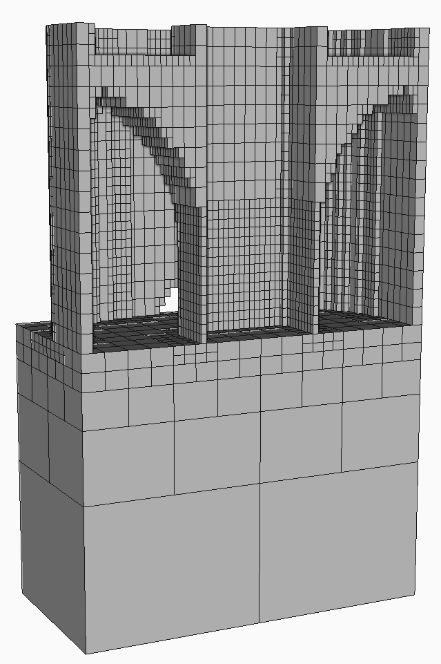 Now the outside wall should have two elements through the cross-section. Note also that the resolution of the mesh varies by region. Critical areas of the part, such as curves, are rendered with small voxels, while the inside of the build plate uses larger elements, with hanging or constrained nodes. This adaptive mesh resolution allows Simulation Utility to generate both preview meshes and full simulations very quickly.