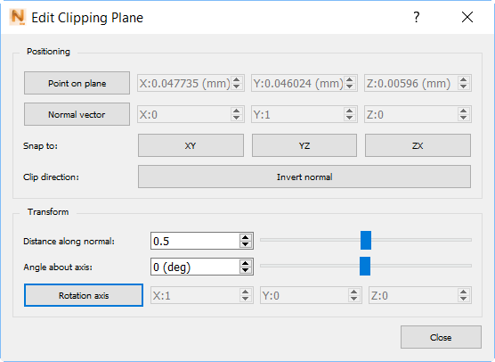 If the cross section is facing away from you, click Invert Normal to see it correctly. In the Transform box, try using the Distance along normal and Angle about axis sliders to adjust the clipping plane, noting that you can also set numeric values. Manual adjustments are also possible if you move your cursor onto the clipping plane or the handle projecting from it.