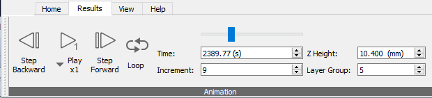 When using the Animation panel, the timeline, and the log files to post-process results, it is important to understand what is reported at each increment. During the mechanical analysis, each layer group is typically broken into two increments. The first increment activates the material of the layer. During this increment, the entire layer group is instantaneously activated in a molten state. The second increment is when the entire layer group cools and contracts.
