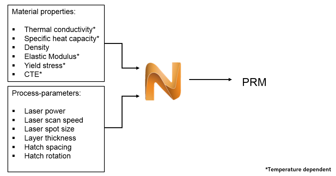 A processing parameter (PRM) file records machine process parameters and material properties. A moving heat source is applied to the material on a small-scale analysis. The PRM file stores the mechanical response of the material to the machine parameter setting. This can be extrapolated to a full part. For each new material or processing parameter set, a new PRM generation must be completed. However the resulting PRM file can be reused for any future simulation using the same combination of material and processing parameters.
