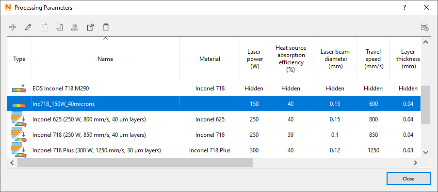 The icon for this PRM file indicates that it is designed specifically for stress and distortion analysis, whereas the other Inconel PRM files shown here are designed for a combination of stress, distortion, lack of fusion, and hotspot analysis