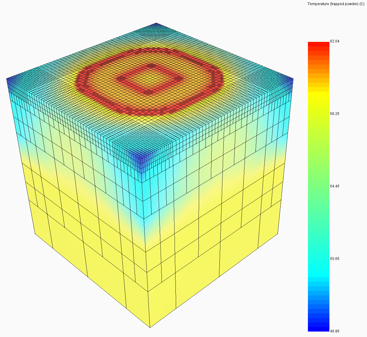 The table below presents a comparison of simulating the same part with uniform heat loss and conduction to loose powder, showing the thermal results after the last deposition layer, mesh details, and run times. This illustrates the trade-offs between increasing model accuracy with improved thermal boundary conditions and the computational demands of the solver.