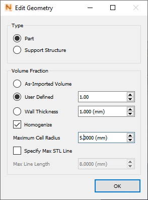 Note that Volume Fraction is set to 1.00 and Homogenize is not selected as this part is fully dense. We will use different settings in this dialog as we import Support Structures and a Lattice component from the Example_22 folder.
