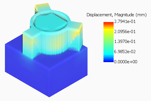 The Displacement results show that the different densities of support structures affects the part scale distortion of these parts. You can use this data to optimize support design, which can be done much more rapidly than if all the supports were modeled directly with very fine meshes.