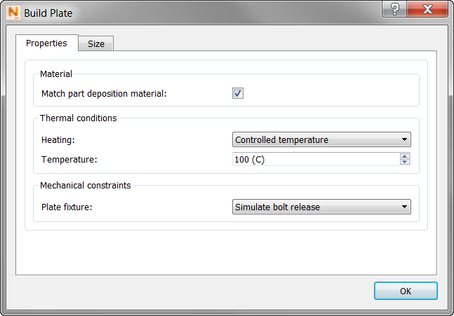 Fix the center of the build plate fixes only the build plate center, to model the case of a build plate held in place on the build platform by gravity and friction alone.