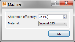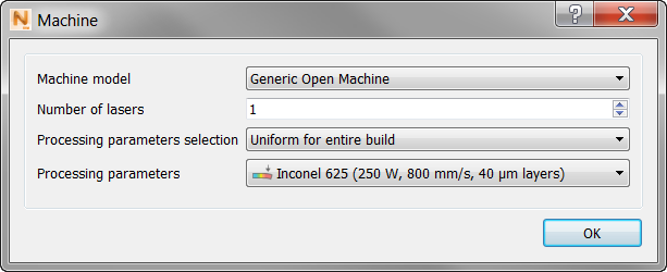 Machine dialog specify the PRM file for the processing parameters and material of the component.