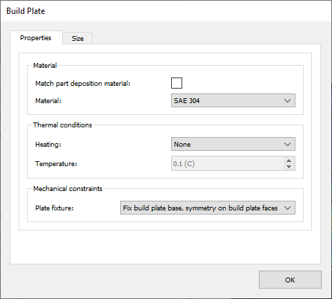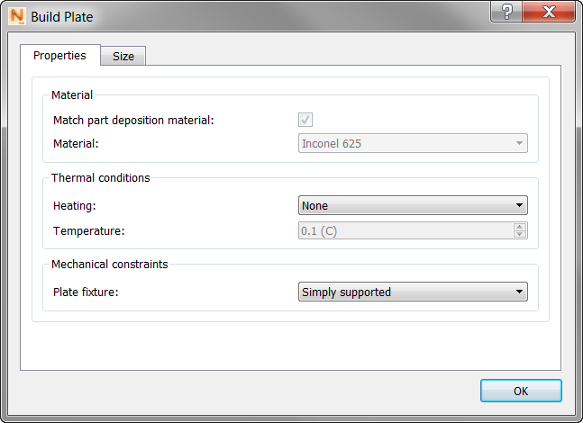 Build Plate panel to specify the build plate material, size, build plate heating, and mechanical constraints.