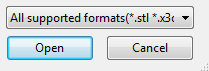 Simulation Utility supports many 3D file types for the part model and the support structures. These are listed in the Supported File Types topic. In the Import model window (the first one to open when you start an import operation), in the lower right corner, you can also click the ‘All supported formats’ list to see the supported format names and file extensions.