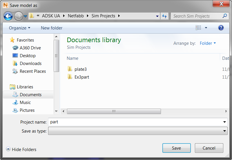 By default, the name of the folder that contained the imported STL part appears in the Project name field, and will be the name of the project folder, unless you decide to change it here. If you use the Save As command, the folder will have a numeric suffix in the name (example: part1), and will be created at the same level as the project folder, unless you decide to move it. The model file (part.tivus in this example) is created inside the folder. When you run a simulation, related files will also be created inside the project folder. If you do not want to run the simulation now, you can do it later by clicking and selecting the saved TIVUS file.