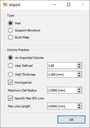When support structure STL files are imported, users must specify the Volume Fraction, which is used for homogenization, and indicates the amount of support volume that is occupied by solid structures rather than empty space. So a user defined volume fraction of 1.00 is a fully solid structure, while a volume fraction of 0.25 is 25% solid, and 75% empty space. It is recommended that homogenized support structures be used instead of fine lattice structures, to reduce both memory requirements and computational time. See Homogenization of Support Structures for more information.