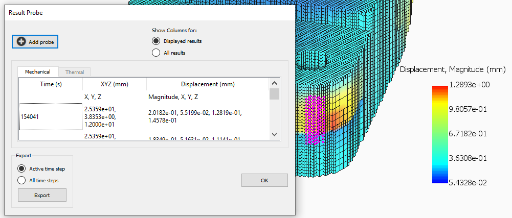 In the Result Probe dialog, you can use the Export controls to export the Result Probe table values in CSV format for use in spreadsheets, plots, and other forms of post-process analysis. Choose to export values for only the displayed increment (time step), or for the entire simulation.