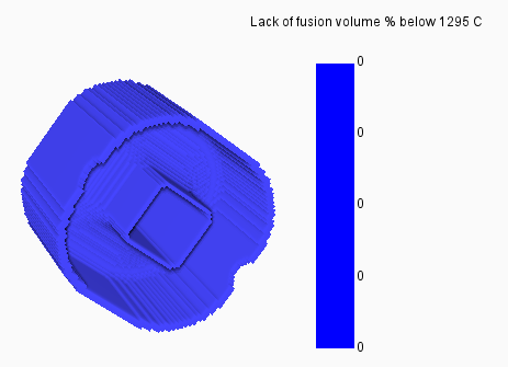 Lack of fusion temperature - This specifies the temperature(s) below which the part will not fully fuse, typically the Liquidus temperature, Solidus temperature, or both. The reported result from this during part level thermal simulations is an indication of what percentage of each element is likely to fall below that temperature. For conservative models, use temperatures lower than the Solidus temperature of that material.