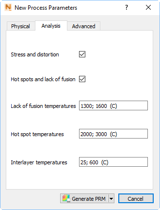 By means of the two check boxes at the top, you can specify the type of PRM file to create: for Stress and distortion analysis, Hot spots and lack of fusion analysis, or both. The three temperature fields at the bottom of this dialog are active only if you select Hot Spots and lack of fusion. The temperatures that should be set for this type of PRM generation are as follows: