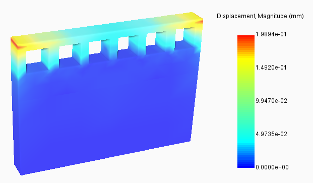 The figure shows simulation results using the file Example_12.stl. Note the areas of maximum displacement at the upper, outer corners of the original part. A closer look shows that these outer corners are displaced slightly inward, toward the center of the part.