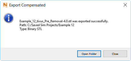 The Export Compensated dialog shows you the name of the warped STL file, which contains the warpage magnification factor in an extension of -4.0.stl, and the path to the file.
