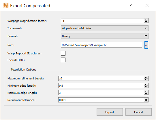 A positive value of 1 in the Warpage Magnification Factor field would export an STL file showing the predicted displacements. A value of –1 would produce a completely compensated STL, applying the full simulated displacements to the original STL dimensions. A value less than –1 would produce an STL file with exaggerated compensation, and a value greater than 1 would produce a distorted file.