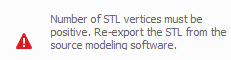 These errors occur when the original STL file is poorly formatted or corrupted. The STL will have to be re-exported from the CAD package used to original create the file.