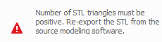 If a non-manifold STL is used, the solver attempts to repair the STL using the Netfabb Repair script. If this process fails, one or both of the above errors will be issued. The part may repaired using the Netfabb Extended repair, or it may need to be regenerated from CAD tool which was used to generate the original STL file.