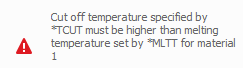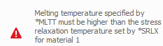 These errors occur when material properties are set with incorrect values relative to one another. For melting temperature *MLTT, cut off temperature, *TCUT, and Stress Relaxation temperature *SRLX it is required that *TCUT > *MLTT > *SRLX.