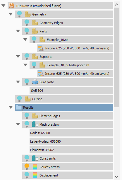 Before running a simulation, you can check the Browser to verify the material and PRM file assigned to the part, and the material for the build plate, if different from the part. After solving a simulation, the Results appear in the Browser. The figure below is only a partial display of Results. Click off the light bulbs (