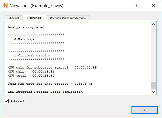 In this example, the warning occurred at increment 12, 6711.15 seconds, when the recoater clearance was –3%.