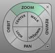 This wheel follows your cursor around the window, and provides mouse-over access to the commands shown. Some commands provide additional on-screen prompts for tasks such as setting the pivot point. Full functionality is best discovered by experimentation. Note that a drop-down menu is provided for access to the Mini Navigation Wheel and other variations.