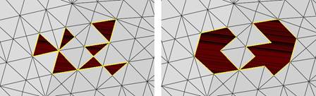 Left: Only one triangle is missing in each hole. They can be repaired with Close Trivial Holes. Right: All attempts to repair all holes regardless of complexity.