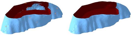 Left: Part with interior shells. Right: After the wrapping operation, only the outer shells remain.