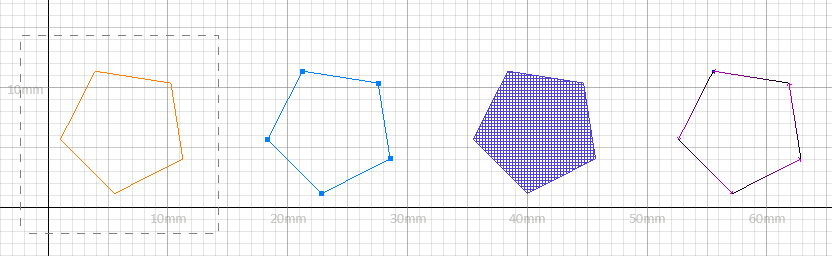 From left: Outbox, corner points, highlighting, and hatch directions. Note the scale.