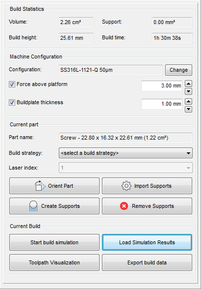 In the Build properties section you select a specific configuration for your machine. Netfabb includes a selection of standard configurations to choose from, but you can also edit existing or create new build configurations. You can also force a distance between the part and the platform. Finally, this section displays volume of the part and support structures, the build height, and the estimated build time.