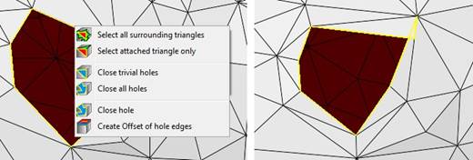 When you offset hole edges, new triangles are inserted at the border edges around the hole. These triangles are created in the same plane as the adjacent triangles.