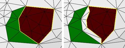 Left: A selection of triangles before the offset. Right: The resulting offset.